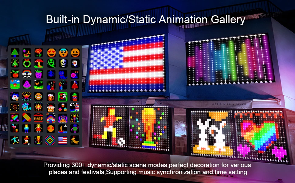 Outside Indoor Flowing Curtain String Lights, Hundreds of Dynamic/Static Animated Pattern for 7th of July,Halloween,Xmas New Year Holiday party etc