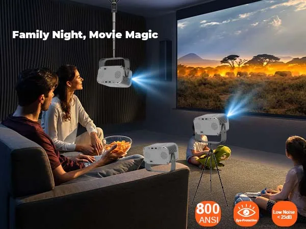 【360° Rotatable/Auto Keystone/800 ANSI】XBJ mini projector with wifi and bluetooth. 800 ANSI brightness delivers clear images in dim rooms, while 360° rotation and auto keystone correction let you project on walls, ceilings, or tents—no need to adjust the device! 1.3:1 throw ratio creates 30–150" screens from 1.2–5m, making it great for camping, RV trips, or backyard movie parties.