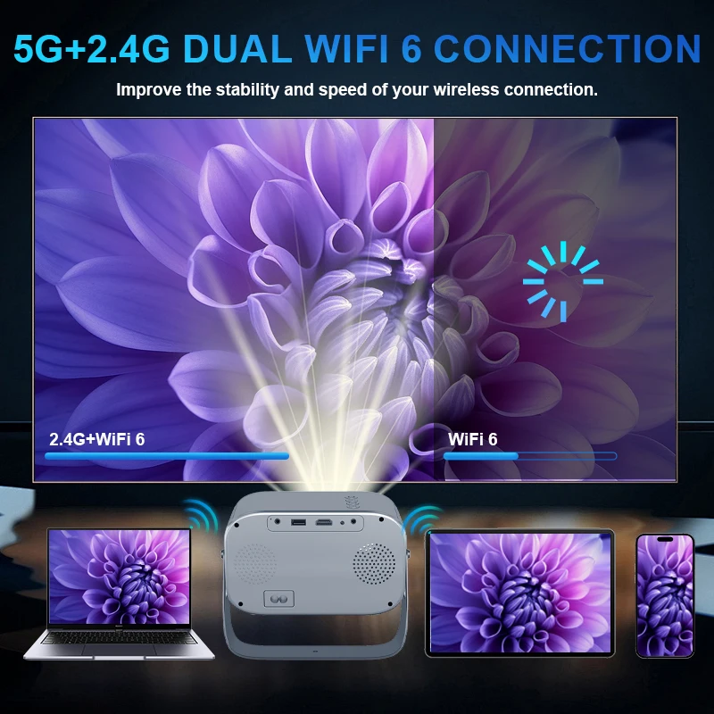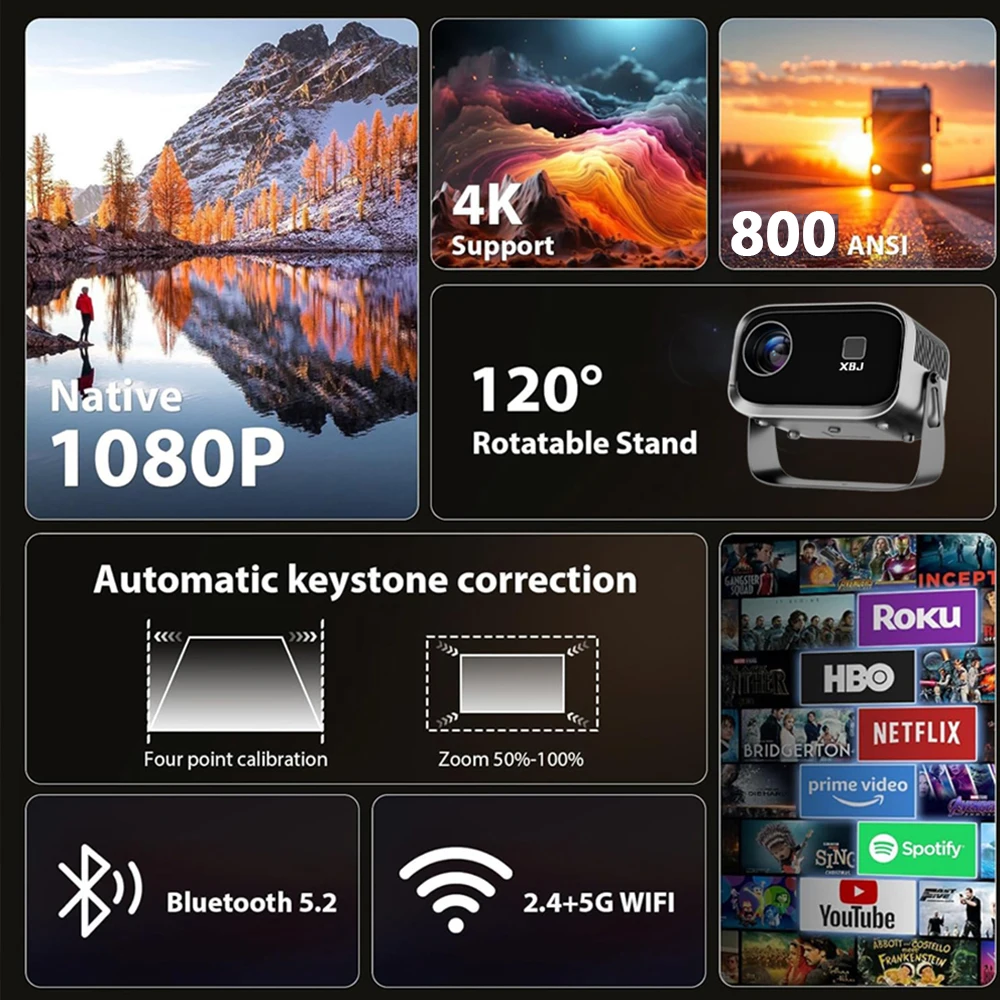 【Smart Android System + WiFi 6 & Bluetooth 5.2】XBJ movie projector for outdoor use. Stream seamlessly via WiFi6 (5GHz band) with pre-installed apps like Netflix/YouTube. Bluetooth 5.2 pairs effortlessly with HiFi speakers/headphones, ideal for game nights, or outdoor gatherings where wireless convenience matters.
